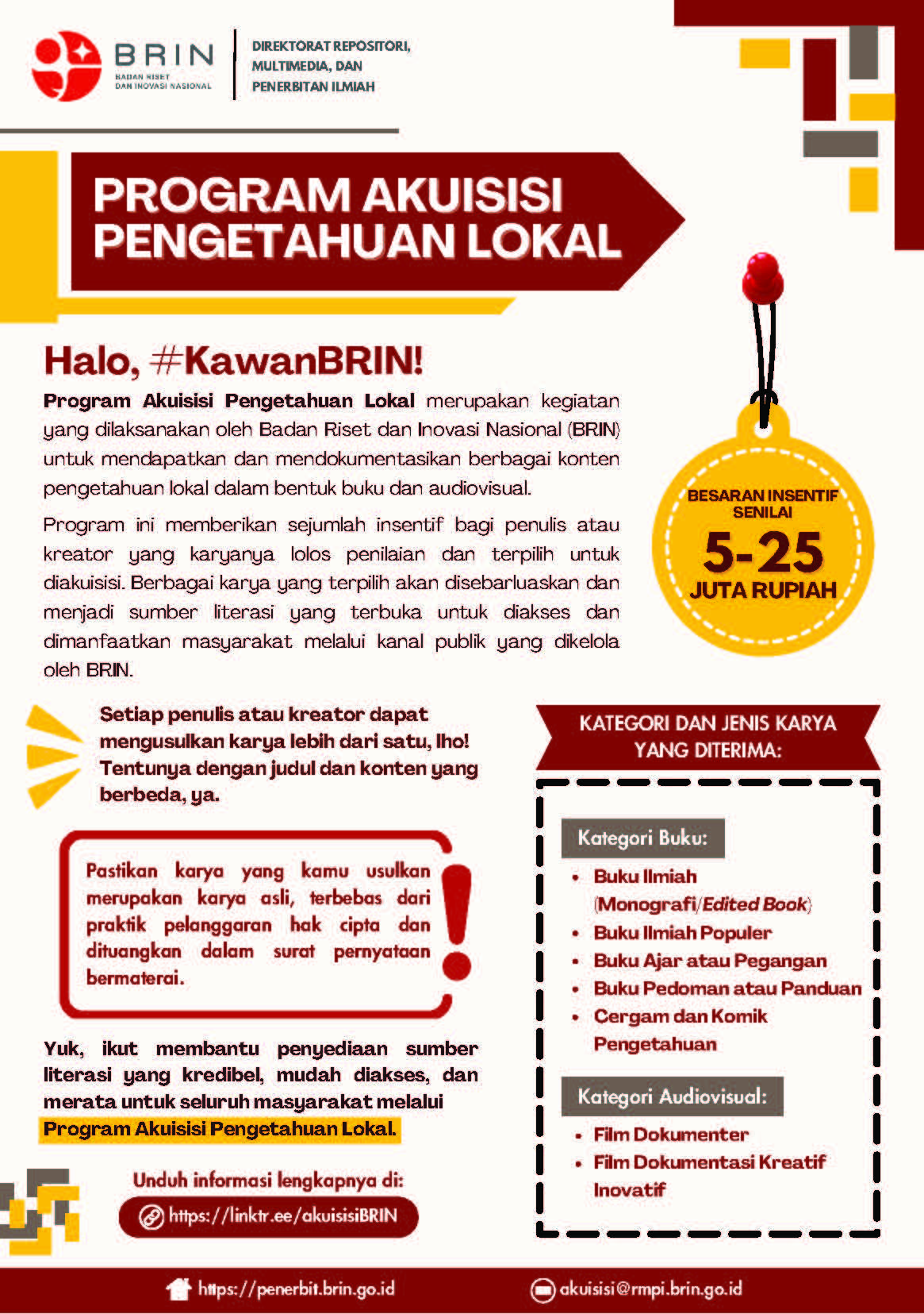 - Jika karya yang diusulkan belum pernah diterbitkan atau berupa manuskrip buku, harus ada rekomendasi dari kepala satuan kerja/toko masyakarat/ahli/pakar dalam bidang ilmu/topik terkait konten yang diusulkan sebagai bukti rekomendasi mengikuti program akuisisi ini. Usulan berupa manuskrip buku jika diterima akan diterbitkan oleh Penerbit BRIN. Insentif akuisisi diberikan setelah buku terbit.